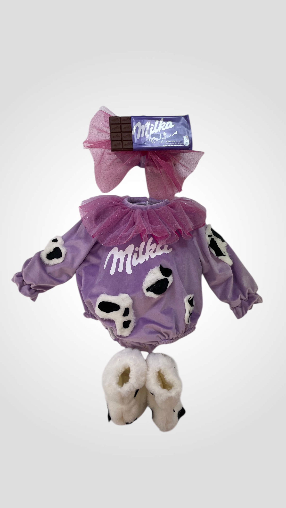 Abito Milka pagliaccetto con stampa. Cappello con fiocco e barretta in 3D