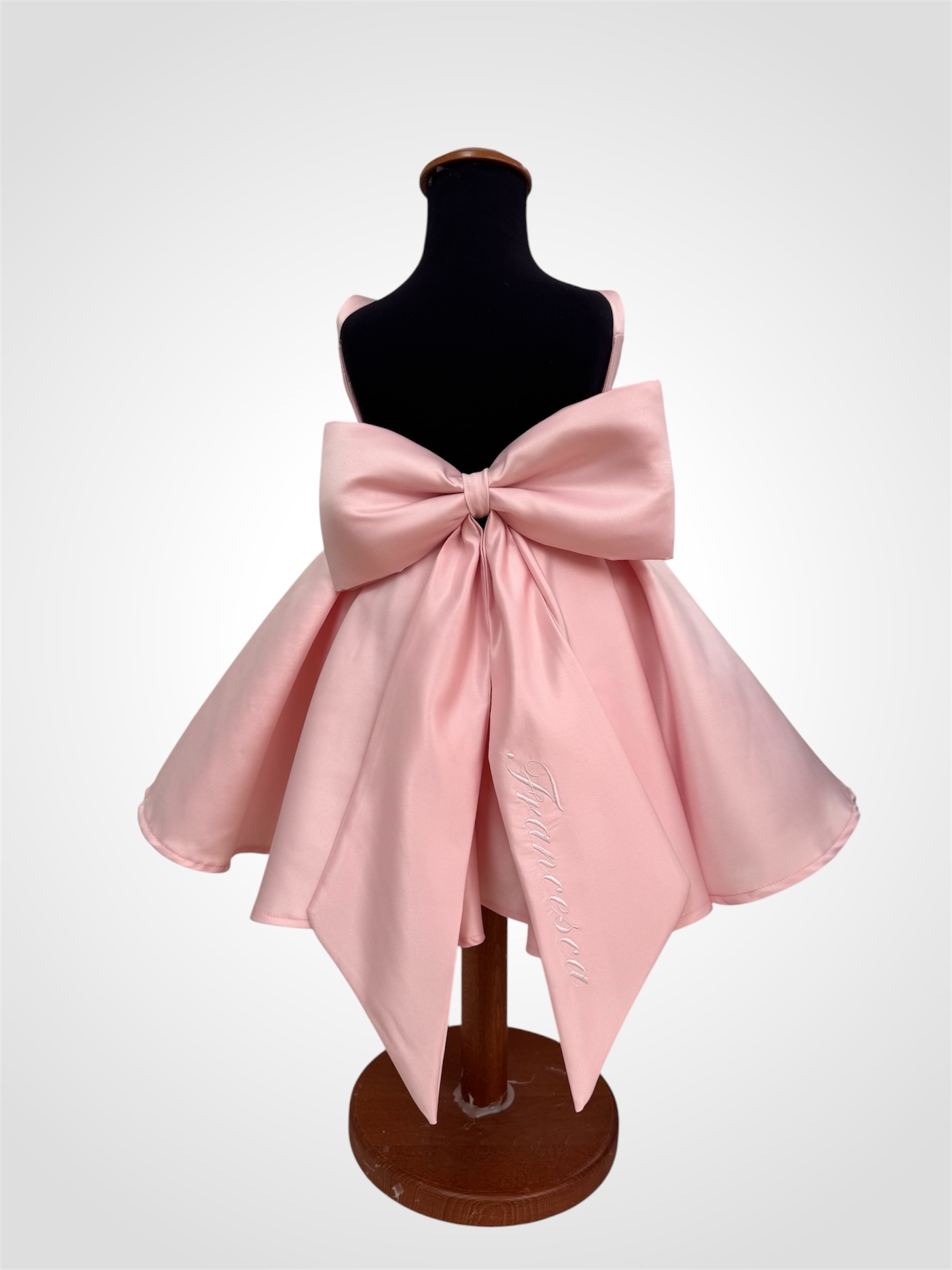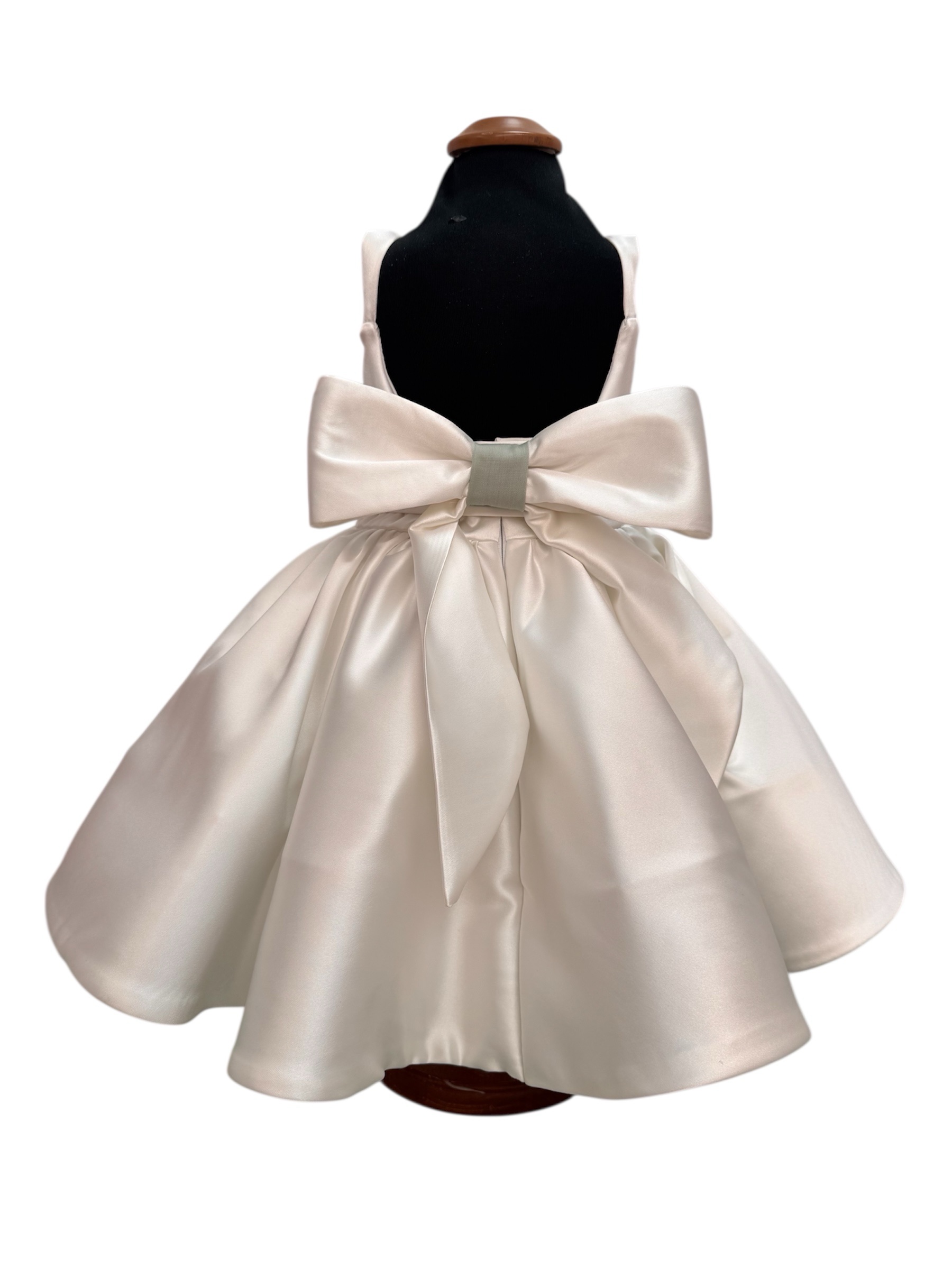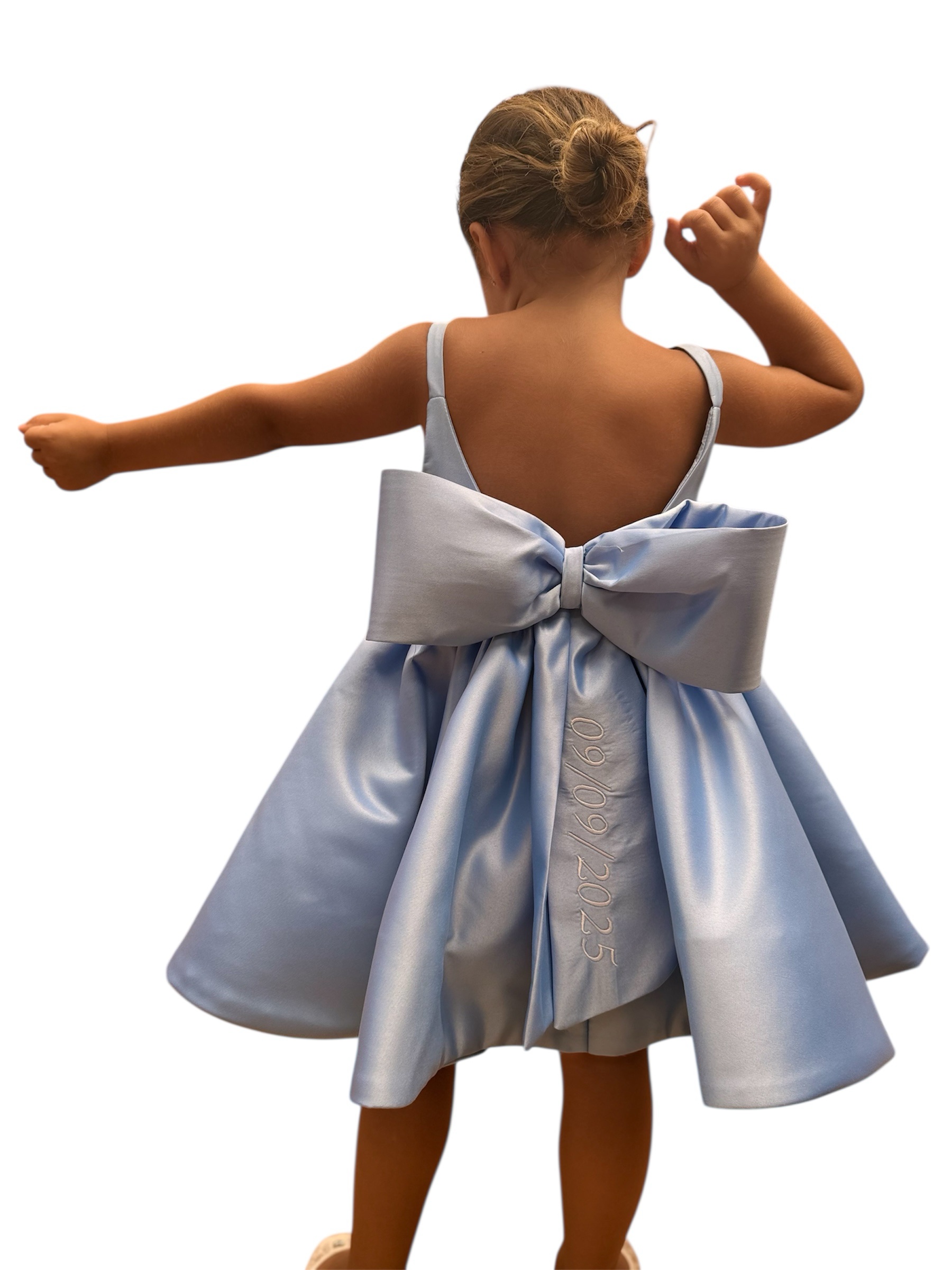 Abito da bambina in duchesse elegante e raffinato, caratterizzato da un delicato scollo profondo sulla schiena e un fiocco personalizzabile che aggiunge un tocco unico. Ideale per occasioni speciali come damigella, compleanni o eventi eleganti. La personalizzazione puรฒ essere indicata nelle note al momento dellโordine.