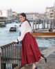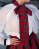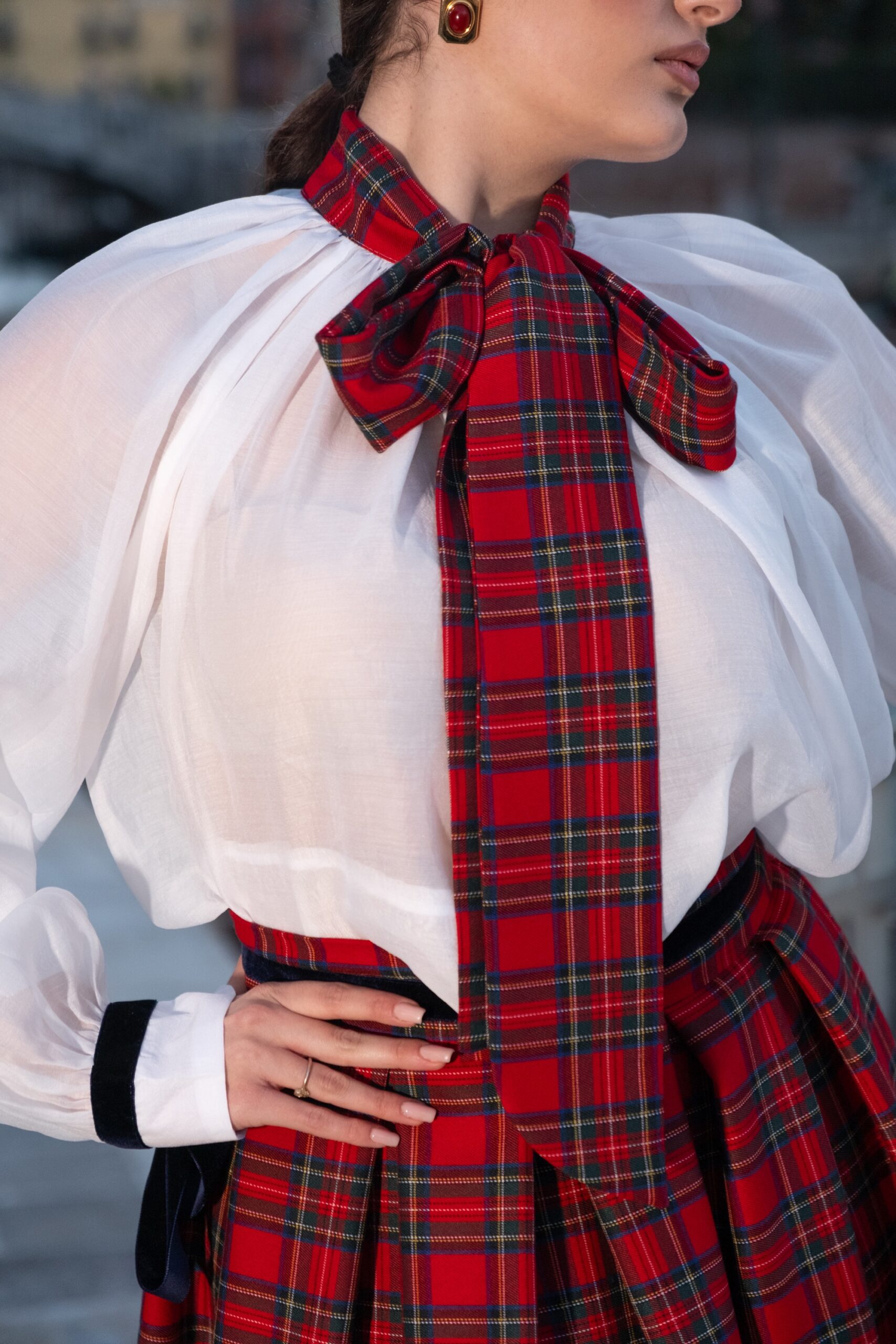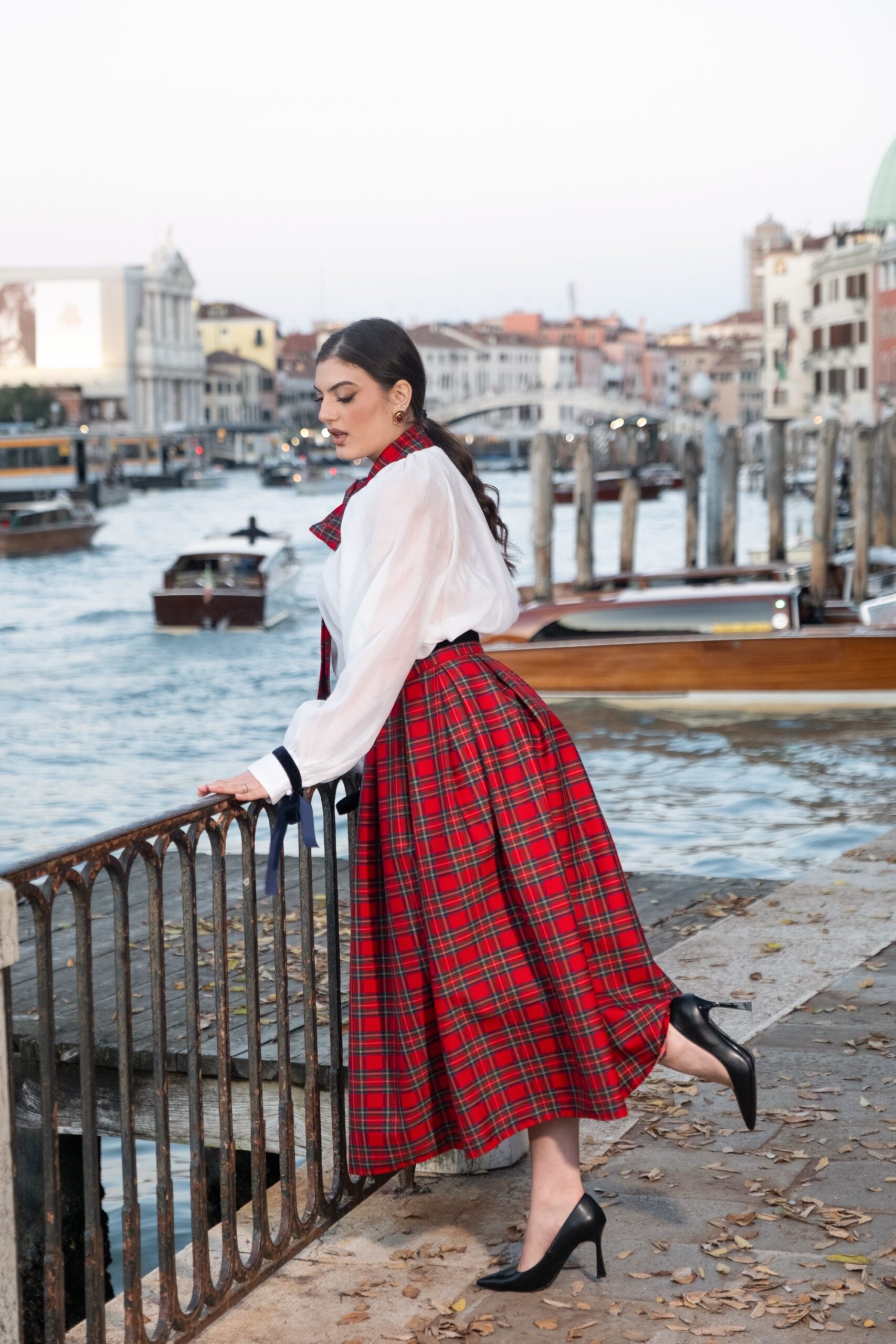 Completo donna elegante e moderno, composto da una camicia in chiffon leggero con raffinati dettagli in tartan rosso e una gonna con pieghe in tartan rosso, che dona movimento e stile. Un outfit sofisticato e femminile, perfetto per occasioni speciali o per un look chic e ricercato.