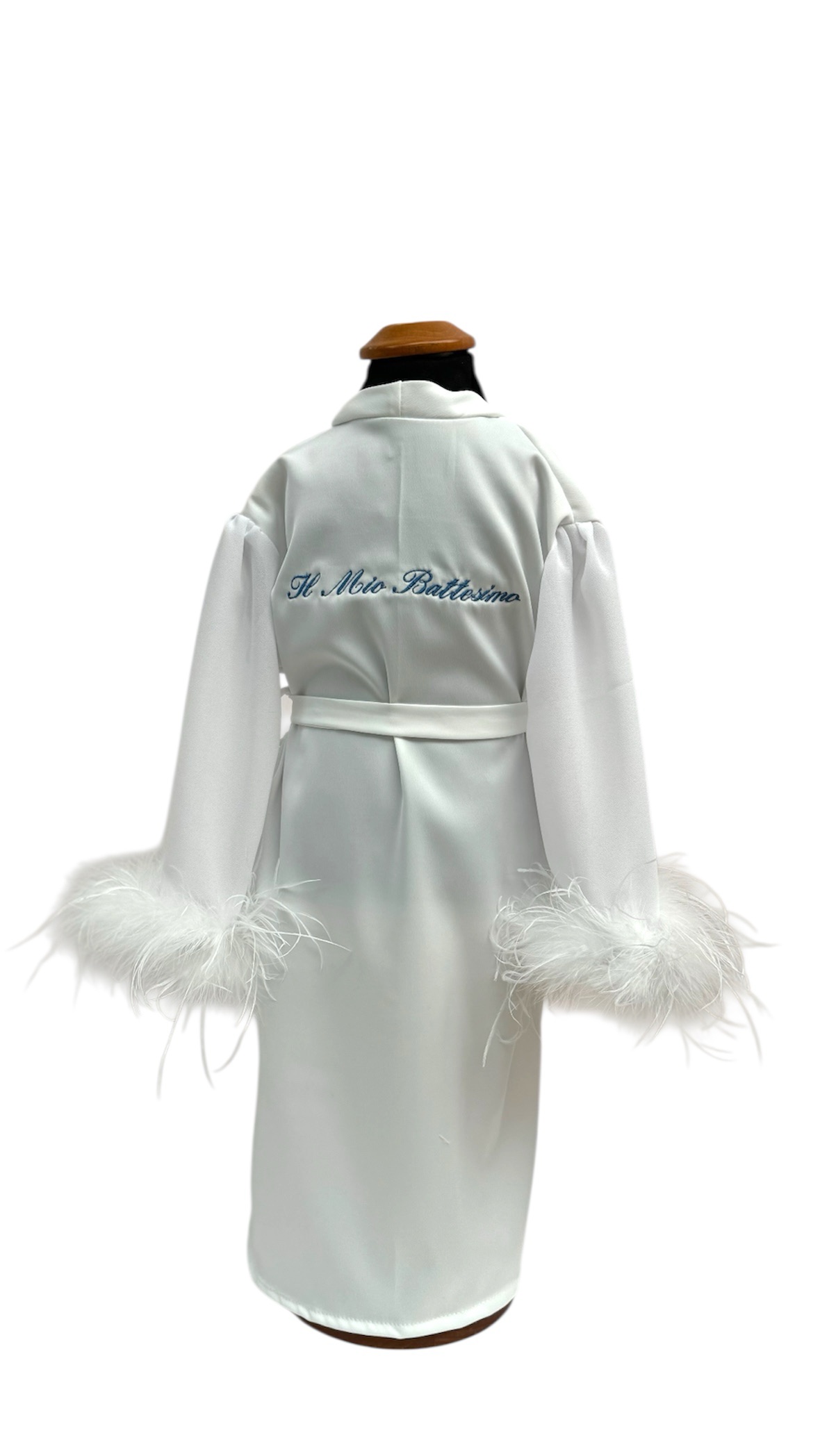 Kimono in seta con maniche in chiffon e piume al polso con incisione “Il mio Battesimo “