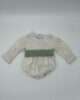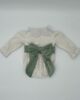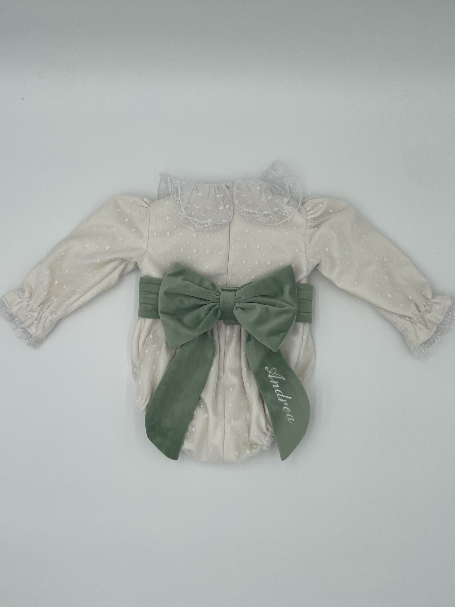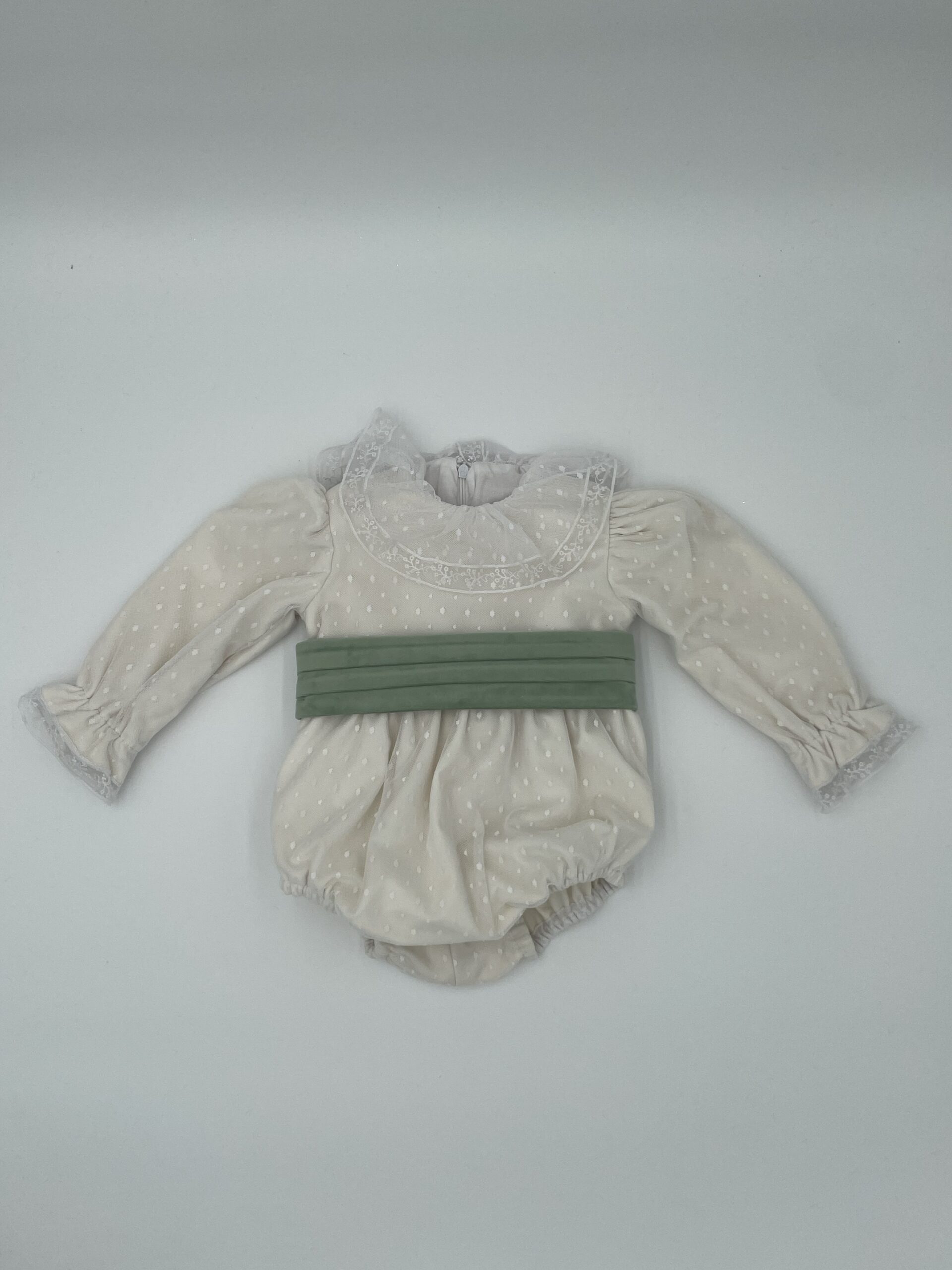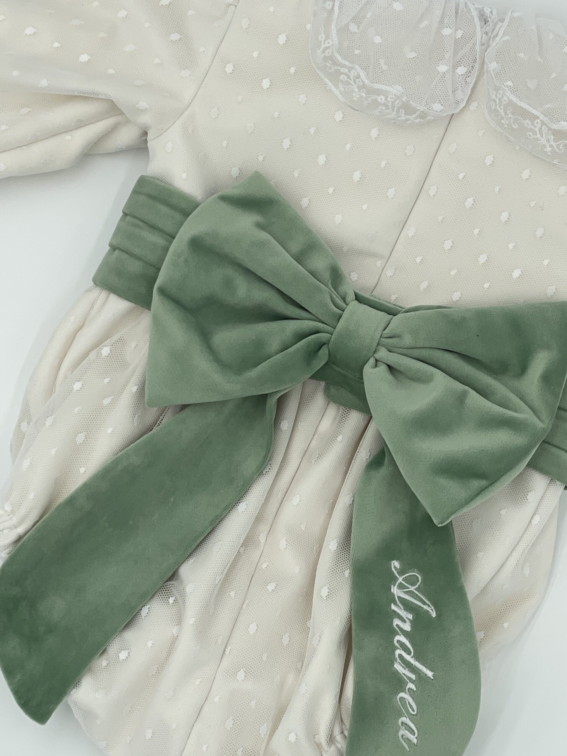 Pagliaccetto in velluto rivestito in tulle pois con cintura verde salvia