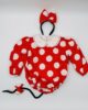 E’ realizzato in rosso co pois bianchi, con coda, cuffie per orecchie e copriscarpe